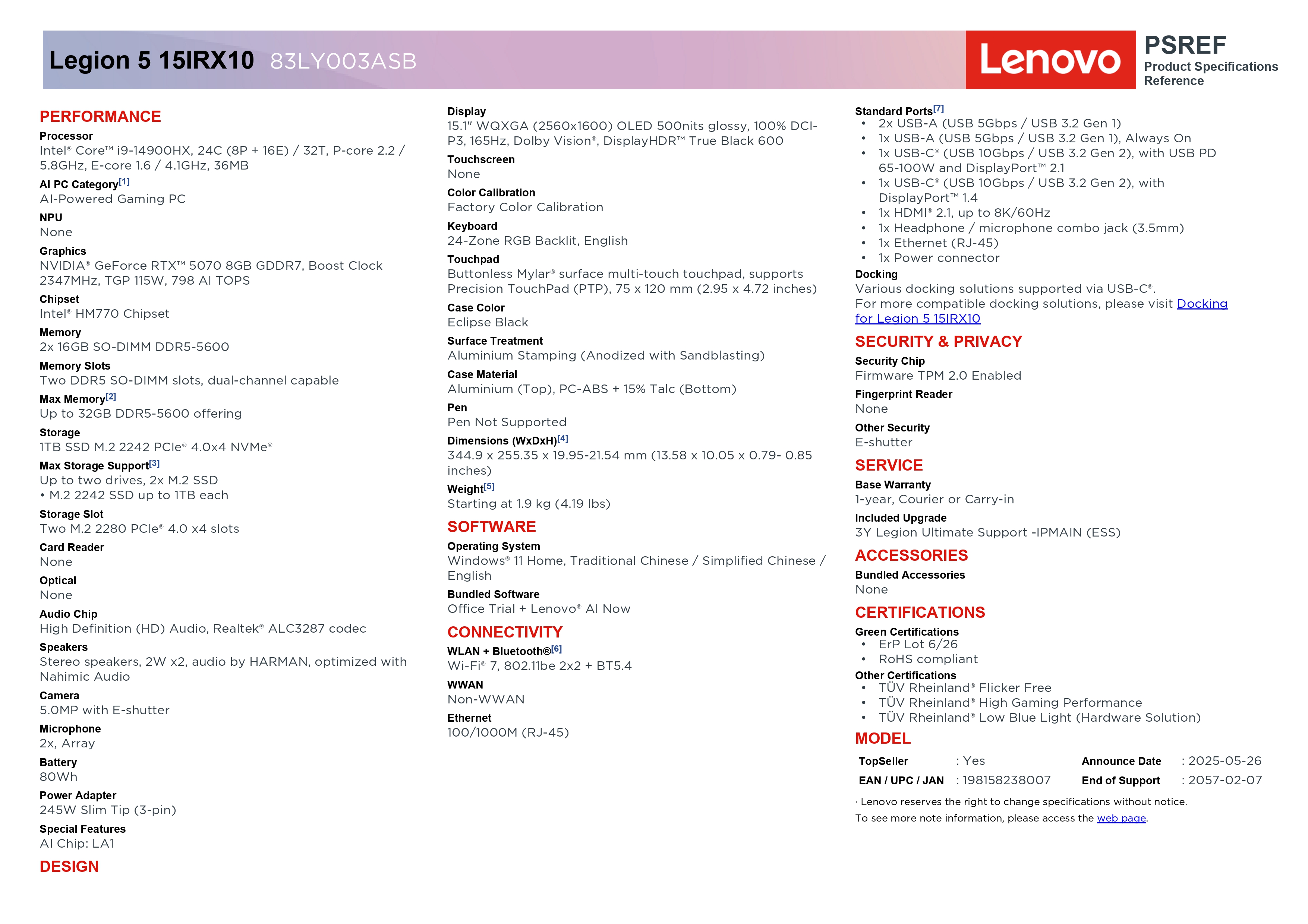 | Network / Communication | Wi-Fi 7, 802.11be 2×2 + BT5.4 |