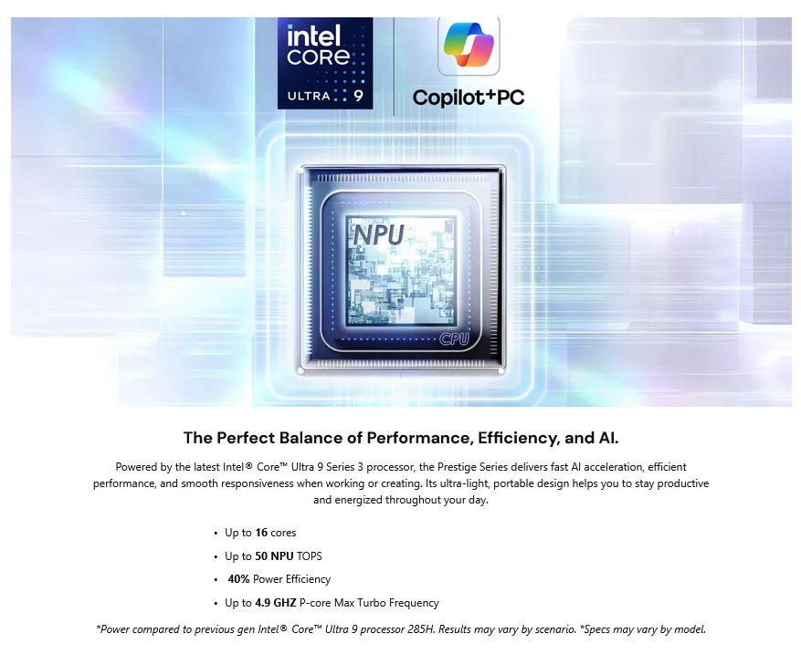 ●CPU Intel Core Ultra 9 processor 386H with up to 50 NPU TOPS