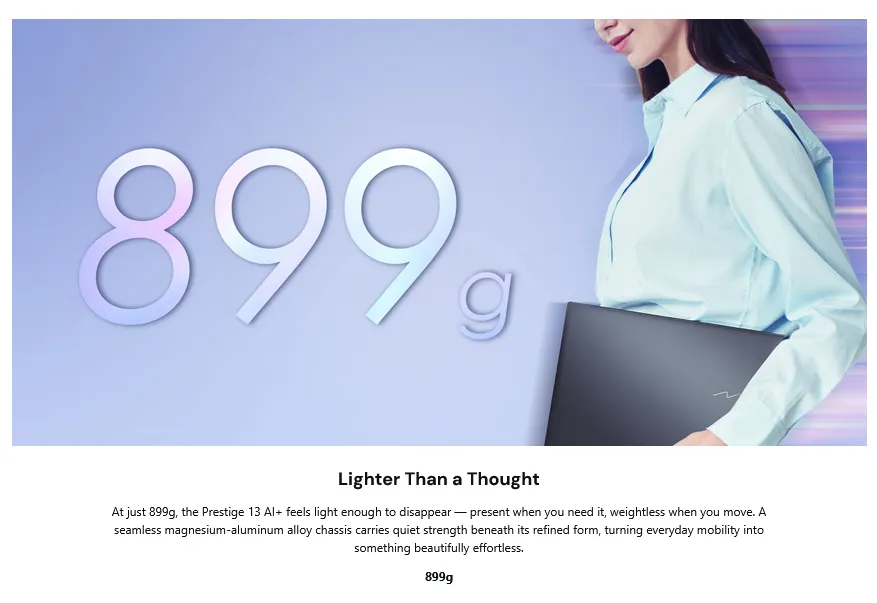Redefine executive mobility with the MSI Prestige 13 AI+ — an ultra-light 899g Copilot+ PC built for modern professionals. Sleek, intelligent, and AI-powered, it delivers refined performance that moves as fast as you do.