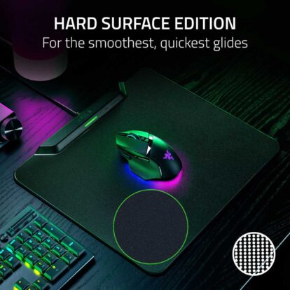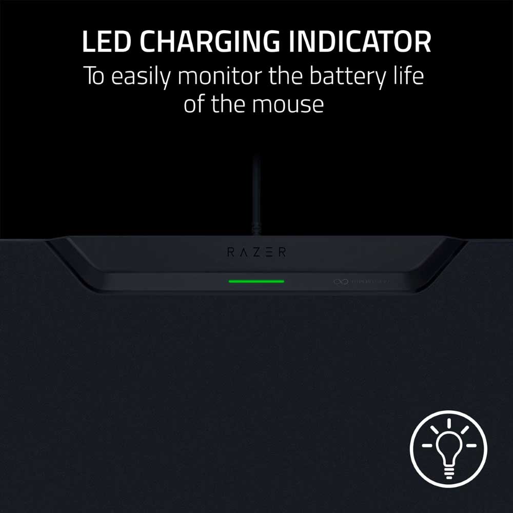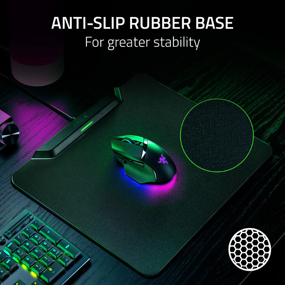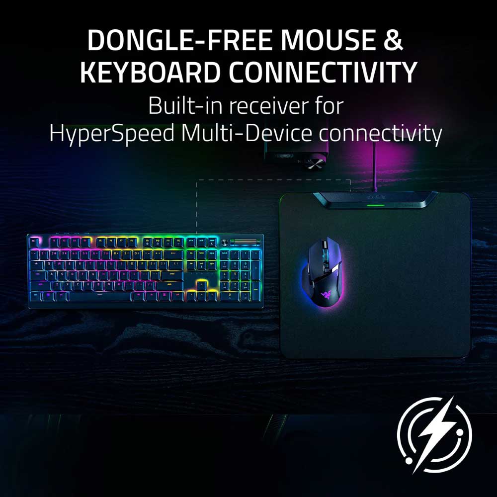 Dongle free mouse and keyboard connectivity – Built-in receiver for HyperSpeed Multi-Device connectivity: Simplify your setup with a mat that connects not only a mouse, but also a HyperSpeed keyboard – Use them without the need for dedicated dongles thanks to HyperSpeed Multi-Device support – Compatible with Razer BlackWidow V4 Mini HyperSpeed, BlackWidow V3 Pro, DeathStalker V2 Pro, DeathStal ker V2 Pro Tenkeyless. Keyboards support multi-device connectivity. For connectivity only, not for wireless charging.