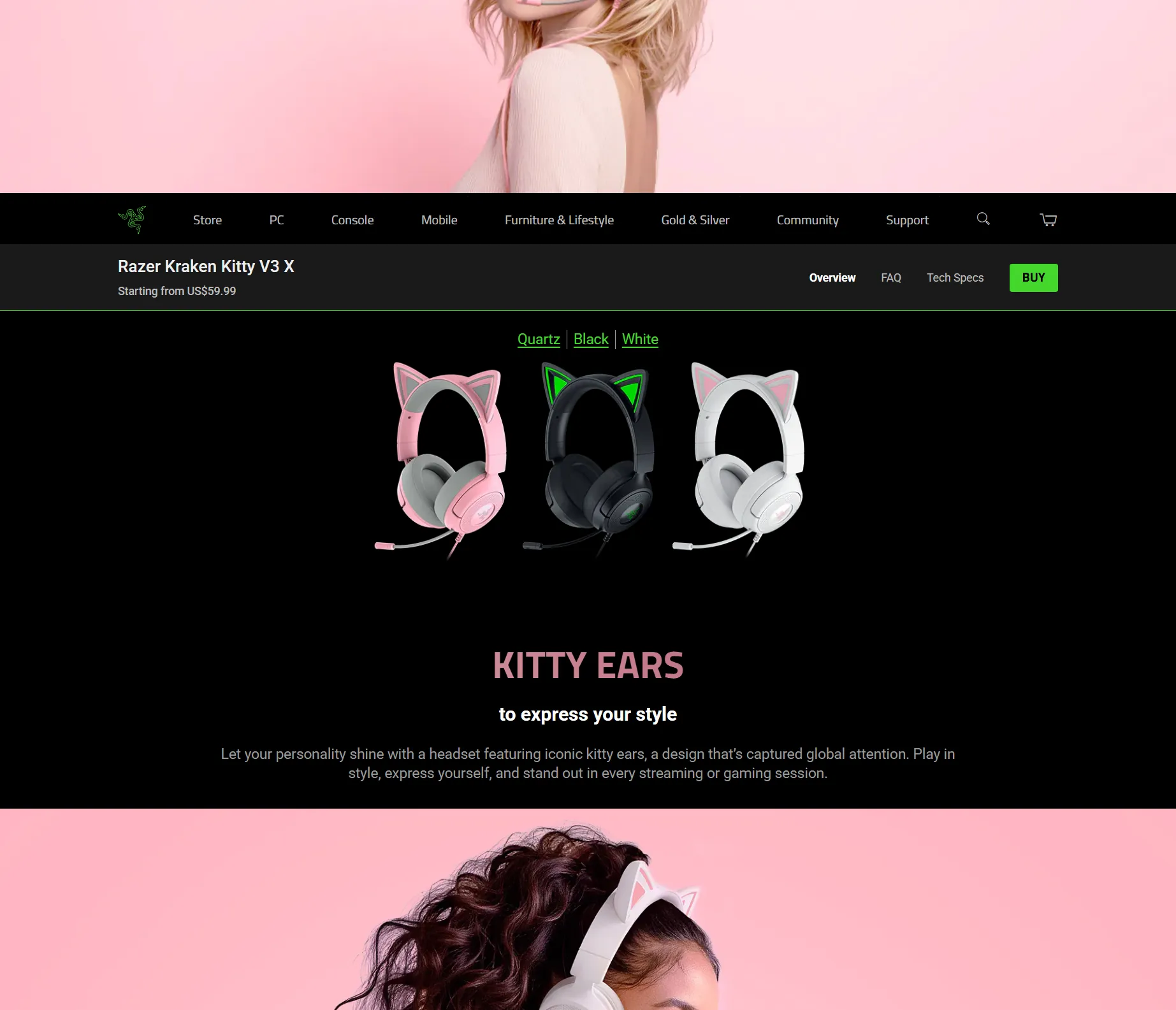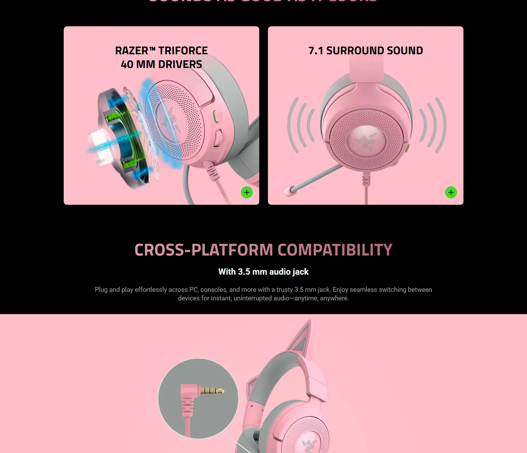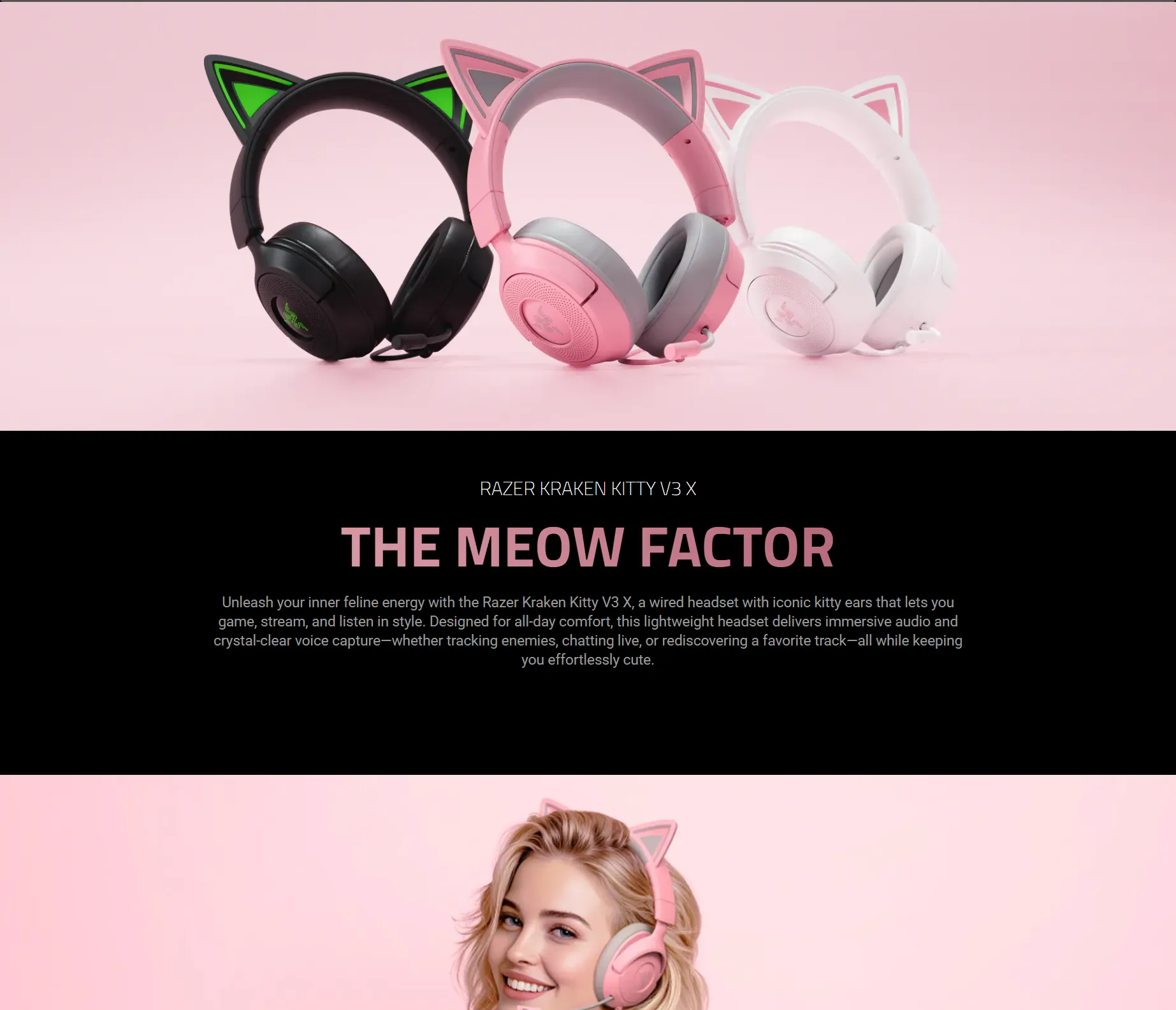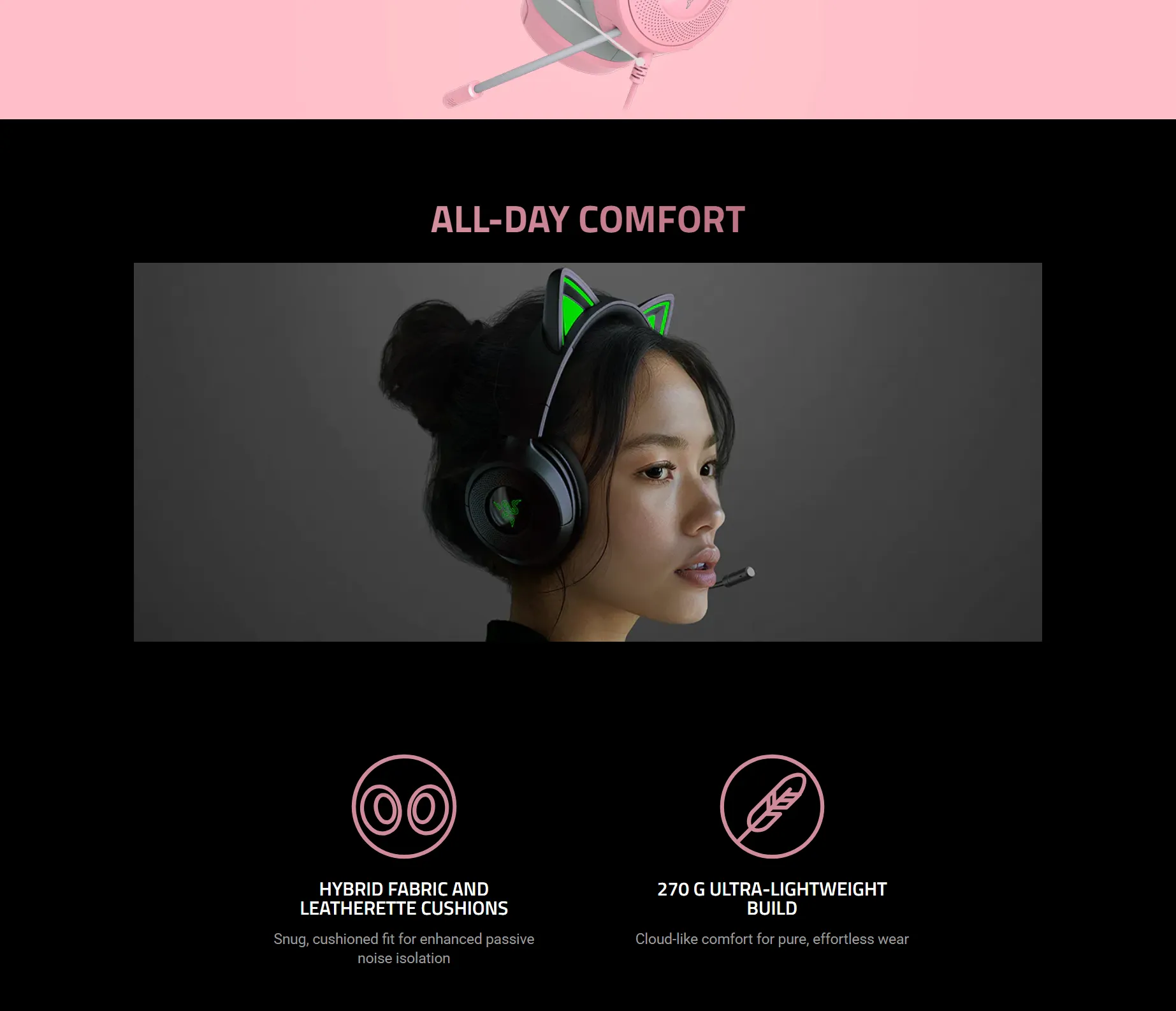 Unleash your inner feline energy with the Razer Kraken Kitty V3 X, a headset with iconic kitty ears that lets you game, stream, and listen in style. Designed for all-day comfort, this lightweight headset delivers immersive audio and crystal-clear voice capture—whether tracking enemies, chatting live, or rediscovering a favorite track—all while keeping you effortlessly cute.