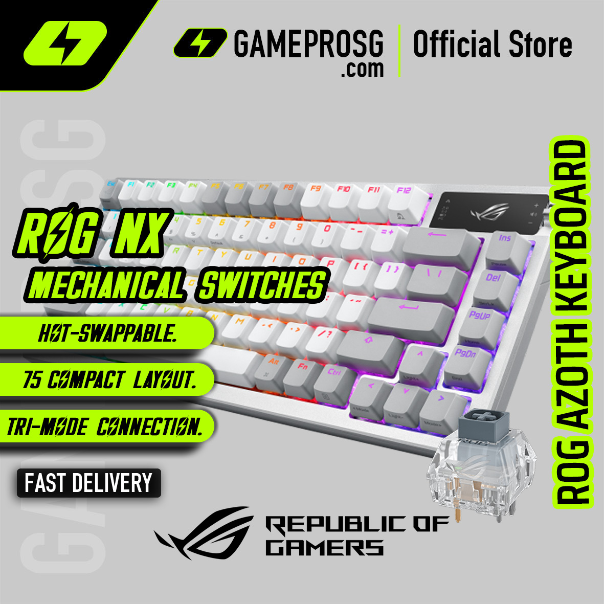 Hot-swappable ROG NX mechanical switches: Pre-lubed switches for smoother clicks and eliminates bouncing noises respectively; fast actuation and ROG-tuned force curves provide great keystroke feel and consistency